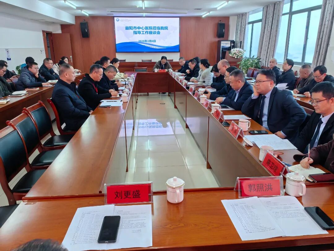 2026年2月6日下午,益阳市中心医院党委书记张晓萍、院长刘文广率领核心临床科室主任及管理骨干组成的专家团队,莅临沅江市人民医院开展高规格学术交流与指导活动。本次活动旨在深化两院协作,推动优质医疗资源下沉,共同提升区域医疗服务能力,活动由我院党委副书记、院长陈毅章主持。