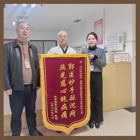 “曹健领航祛病痛,曾丽仁心抚患忧”、“郭医妙手驱沉疴,照光慈心抚病痛”这不仅仅是一份感谢,更是一份沉甸甸的信任。锦旗上巧妙嵌入的医护人员名字,仿佛在无声诉说着这场长达八年的生命守护。