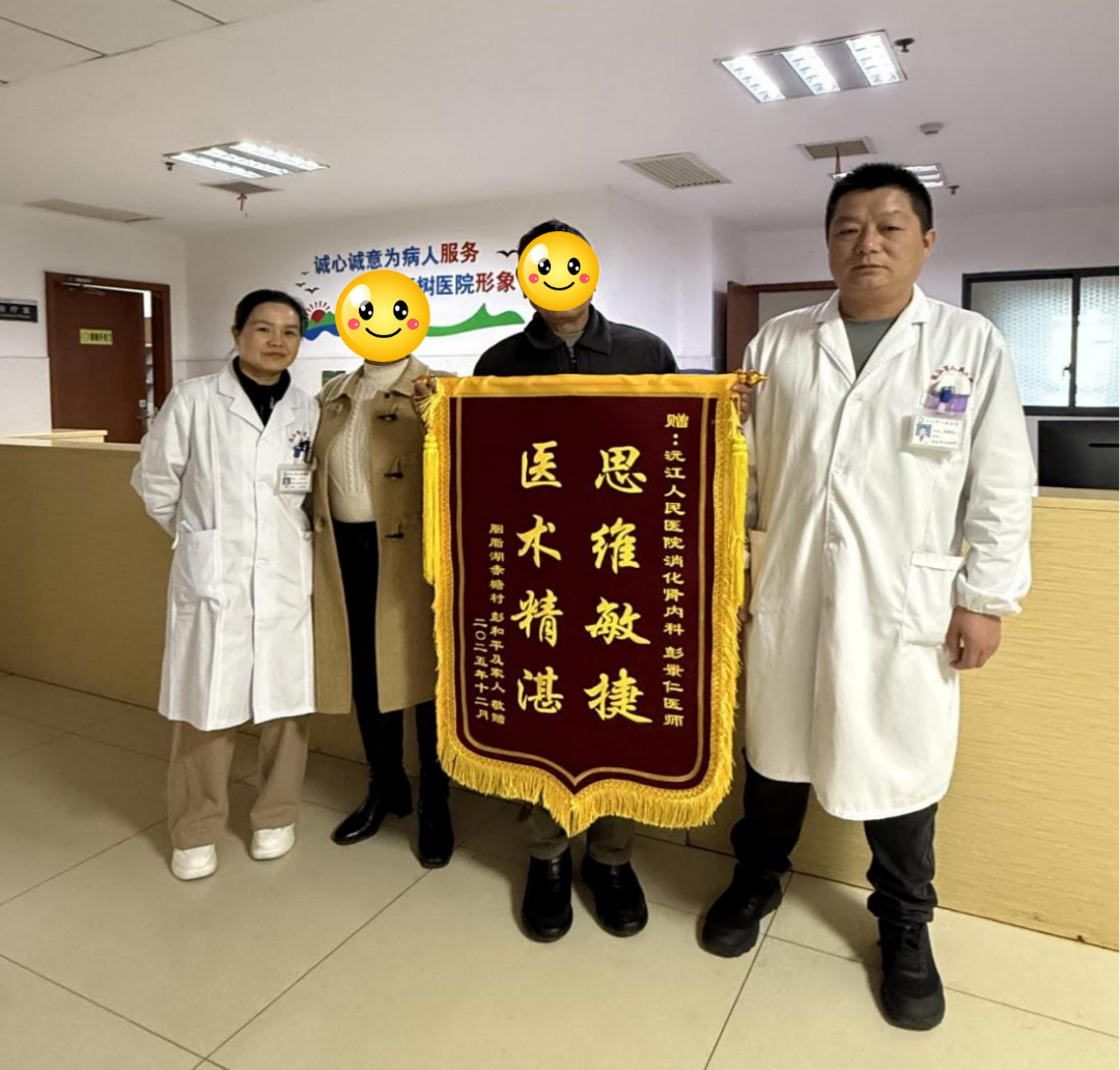 近日,沅江市人民医院消化科的彭医生收到了一份满含敬意的感谢——患者彭大爷及其家属专程送来一面鲜红锦旗。“思维敏捷 医术精湛”的烫金大字,既是对彭医生精准诊疗的由衷赞誉,更是医患同心的温暖见证。
